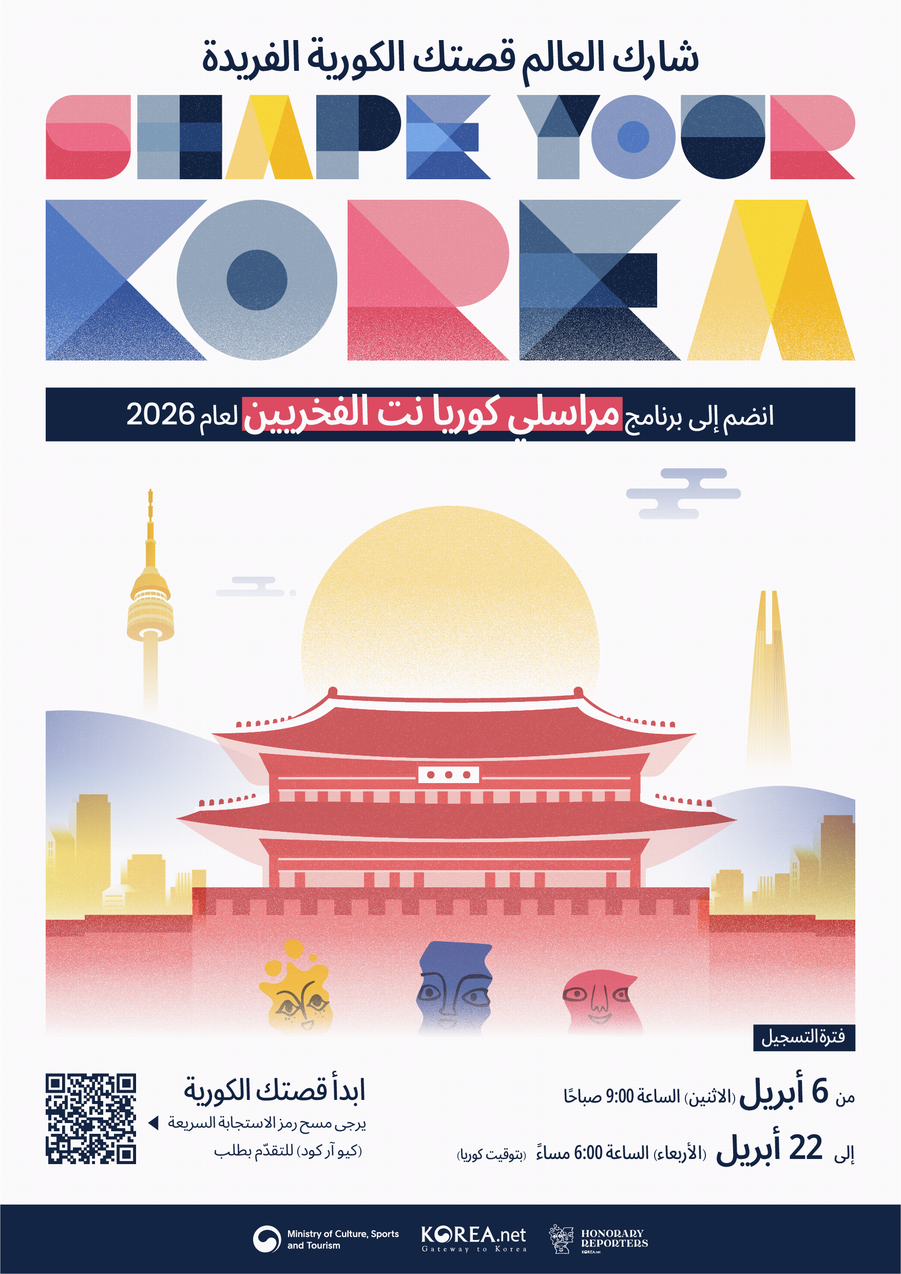 فترة التقديم: من 6 أبريل 2026 الساعة 09:00 صباحًا وحتى 22 أبريل 2026 الساعة 6:00 مساءً (بتوقيت كوريا)
